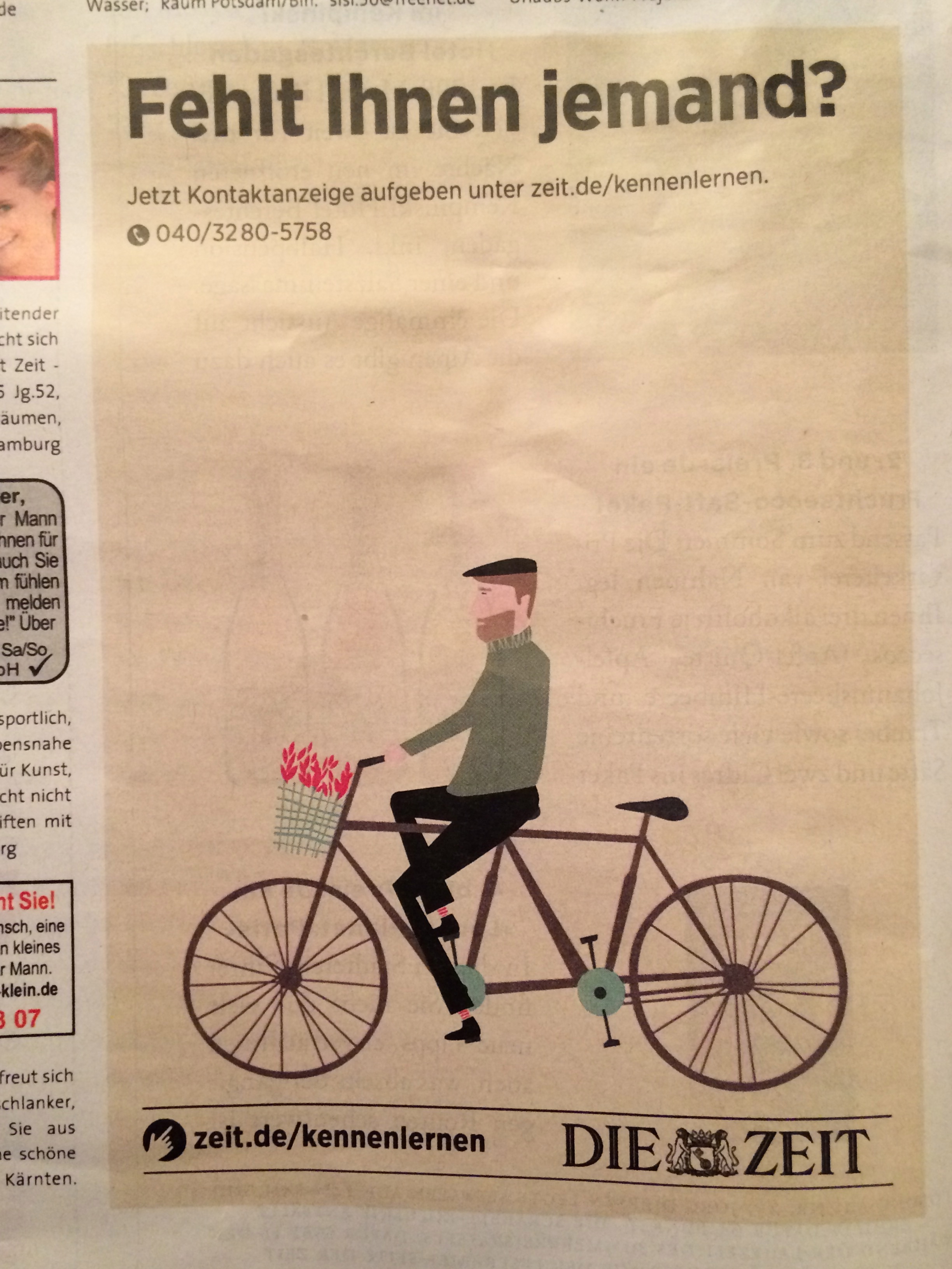 Die Fotostrecke von Josefsohn vorne im Magazin war, Hummus-Brote und Oliven futternd, bereits ein unterhaltsames Vergnügen: Mir vollkommen unbegreiflich, dass die MTV-Kampagne schon zwanzig Jahre alt sein soll, für Kind 1 & 2 sehr überraschend, dass es damals schon Farbfotografie gab. Danach eine geniale Modestrecke, die den Beifall aller fand. Und während wir noch über Looks plaudern und die extrem geniale blaue Hose auf dem letzten Bild, blättert Kind 2 weiter, bis ihr Blick an der Zeichnung eines einsamen Mannes auf einem Tandem hängen bleibt: die Kontaktanzeigen.