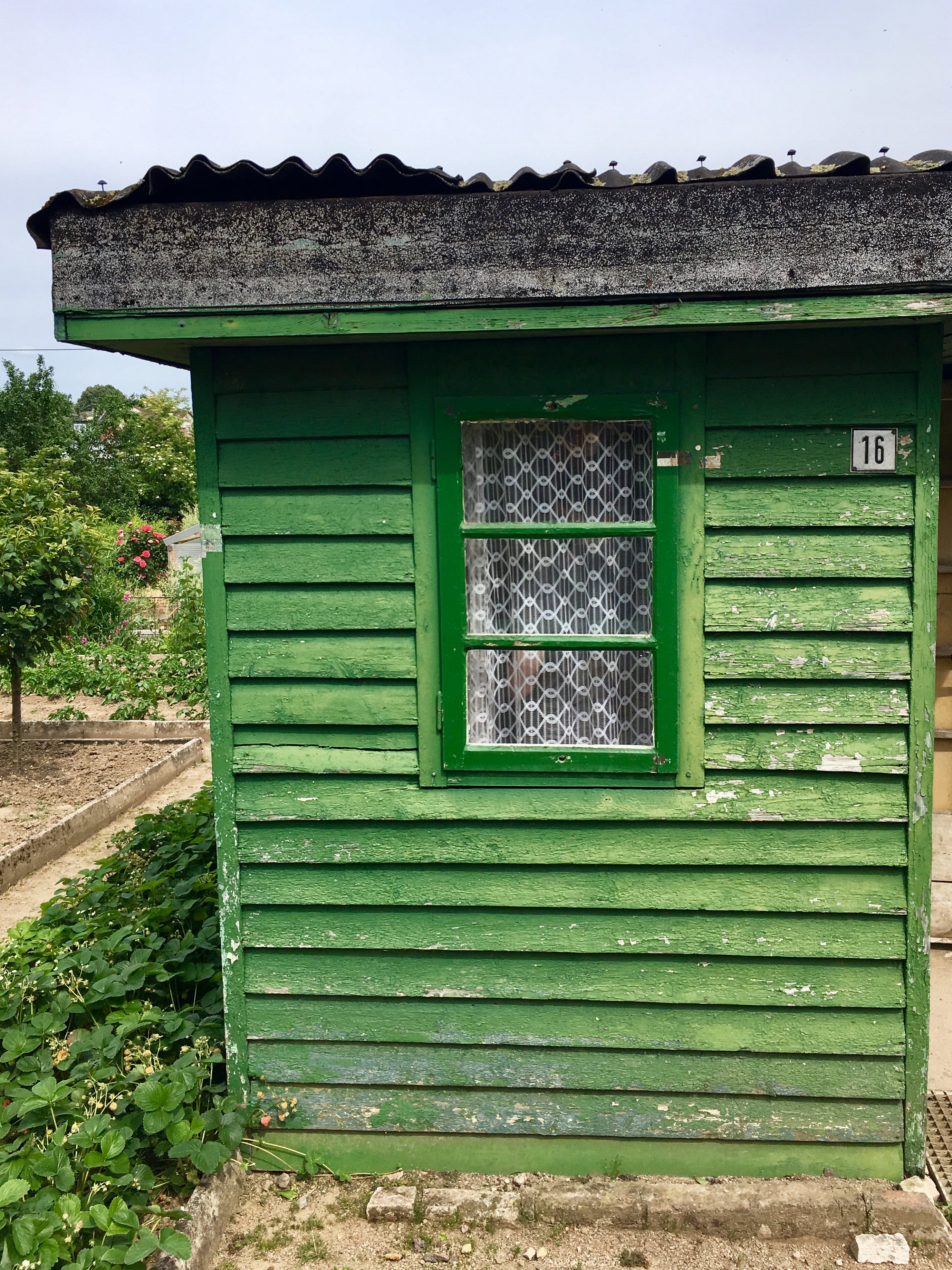 Konsequent sparsam und klein steht die Gartenhütte Typ 2 von Margarete Schütte-Lihotzky mitten im Garten. Eisern demokratisch, lustig grün.