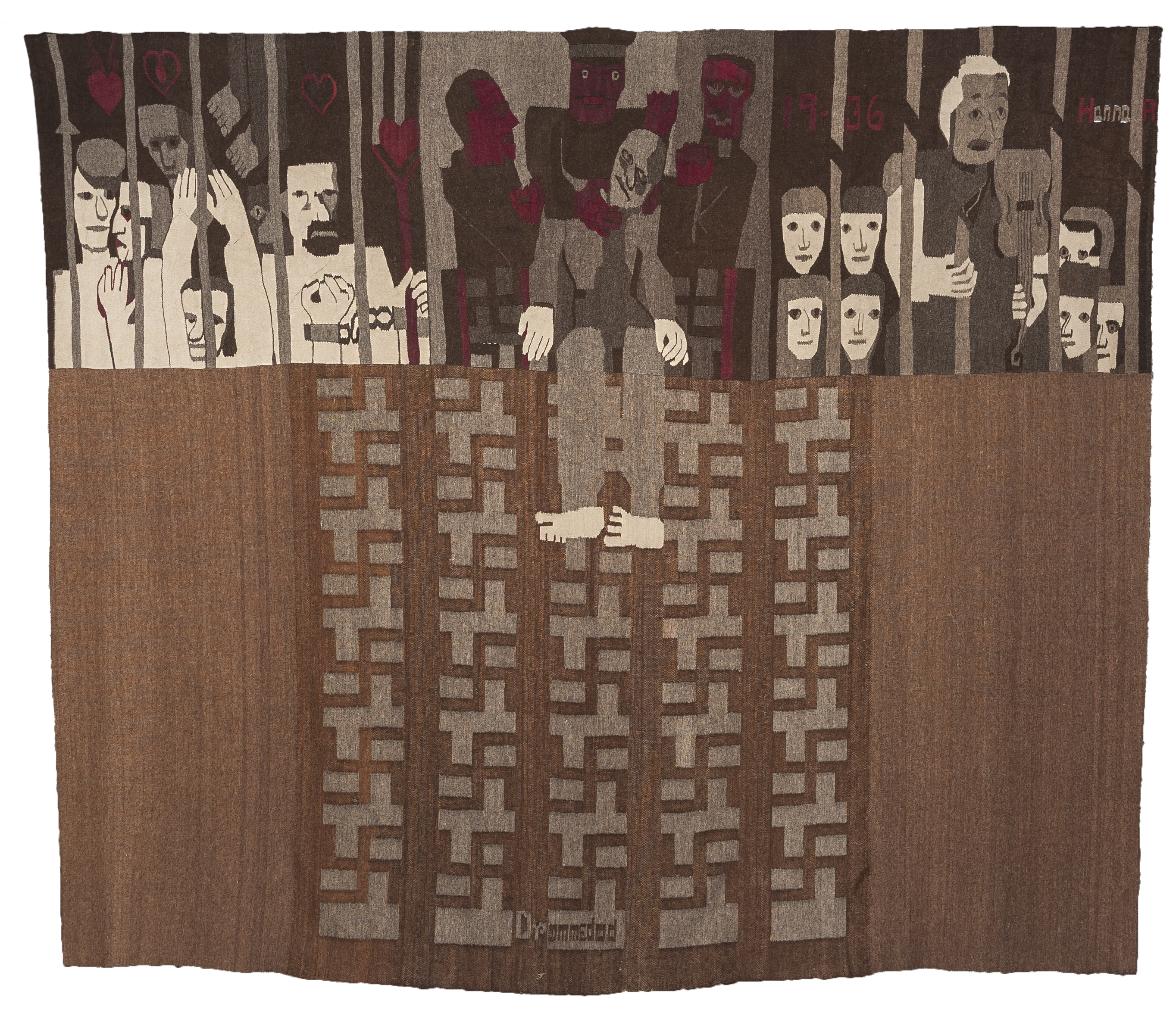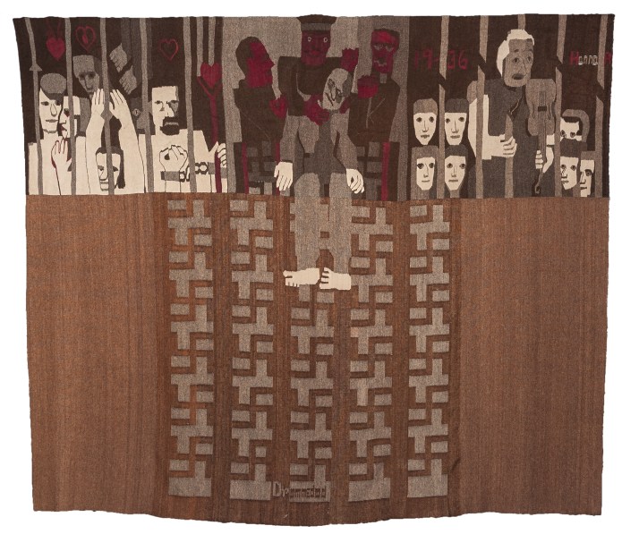 Das Motiv des abgeschlagenen Kopfes taucht in einem anderen Bild wieder auf: Ethiopia von 1935, entstanden kurz nach Mussolinis Invasion in Äthiopien. Haile Selassie hatte den Völkerbund vergebens um Beistand gebeten, das faschistische Italien annektierte das Kaiserreich. In einer Bildreihe sind eine afrikanische Frau, ein europäischer Minister, Hände in verschiedenen Hautfarben, der Kaiser Selassie und schließlich der abgeschlagene Kopf Mussolinis, aufgespießt auf den Speer eines äthiopischen Kämpfers, zu sehen. Die unteren zwei Drittel bestehen aus geometrischen Flächen und Mustern – ein montiertes, sandiges, erdfarbenes, klares Fresko. Ein fast vier Meter langes Protestmanifest ist dieser Teppich und nicht zimperlich in der Motivwahl. Auf der Weltausstellung in Paris 1937 hing der Teppich im norwegischen Pavillon, allerdings zensiert: Mussolinis abgeschlagener Kopf musste nach hinten gerollt werden. Nebenan, im französischen Pavillon, sorgte Picassos Guernica ebenfalls für Furore.